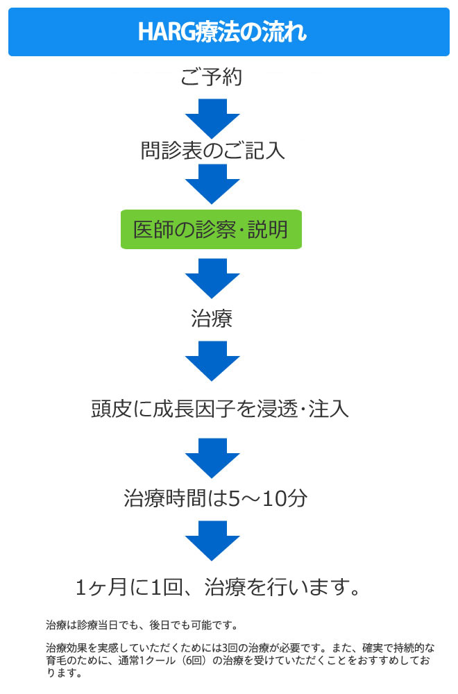 治療スケジュールについて毛髪再生治療は、1ヶ月1回のペースで6回を1クールとして行っていきます。治療期間は約半年がほとんどで、毛髪サイクルの正常化と発毛効果を実感された状態で終了となります。